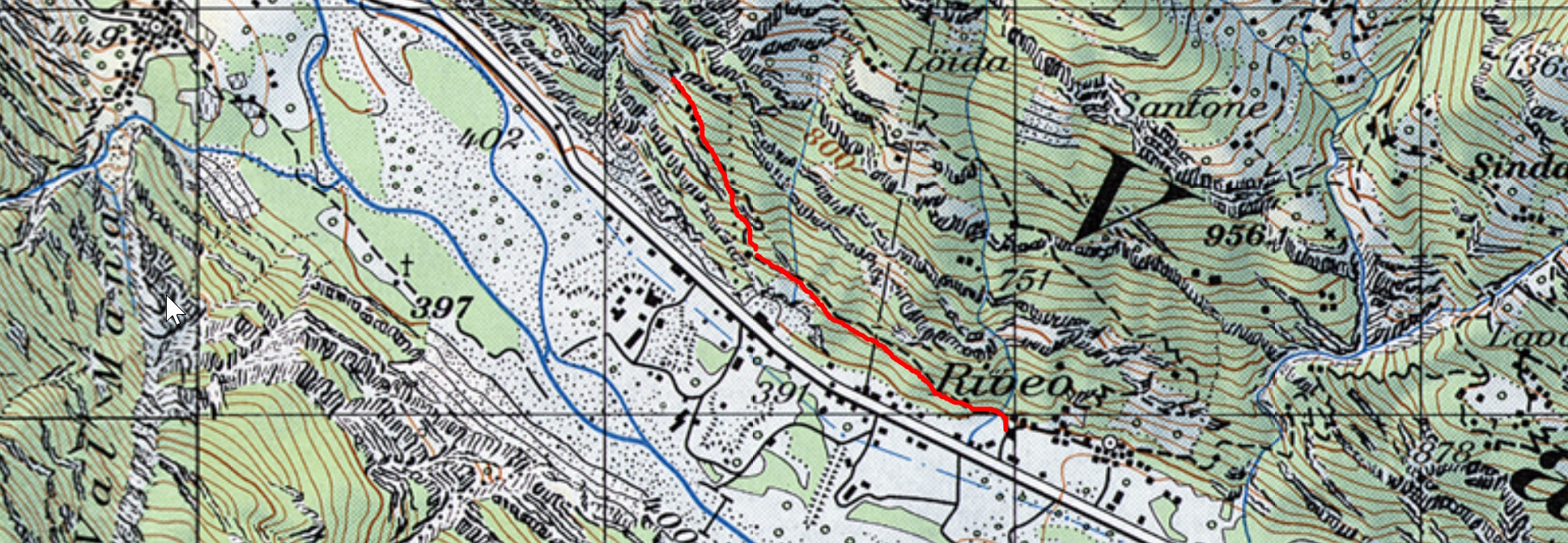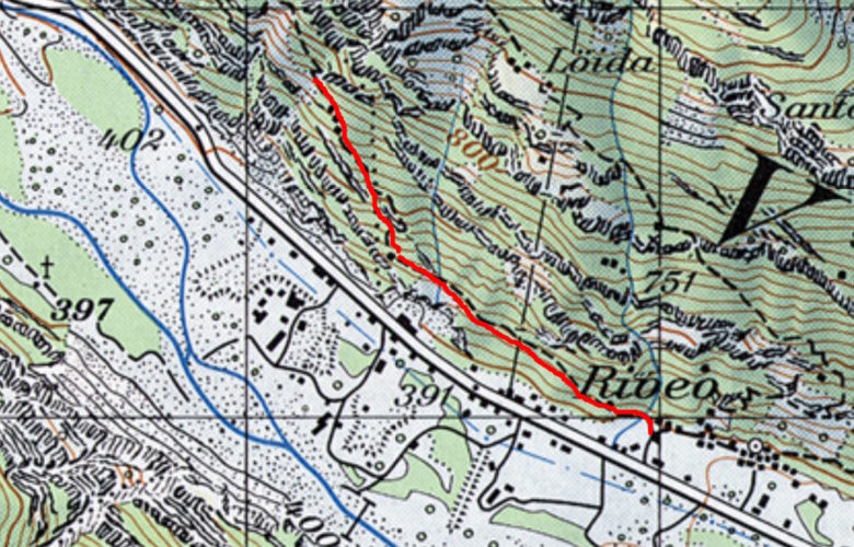 30-40 minuti a piedi da Riveo (attenzione: sentiero piuttosto difficile e non sempre visibile).